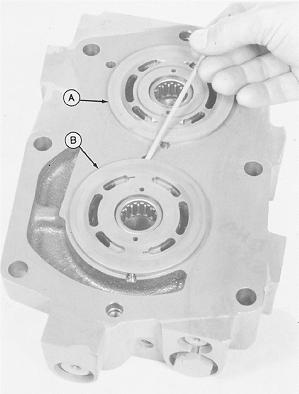 8. Remove valve plates (A and B). If it is necessary to pry valve plates loose from center section, use a wooden dowel and pry only at dowel pin grooves.