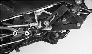 1. With machine in neutral, check that dimension (A) ACROSS THE COILS ONLY on the neutral return spring (B) is 133 mm (5.24 in.). DO NOT allow spring coil length to drop below 120 mm (4.72 in.).