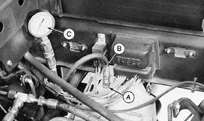 1. With service-park brake pedal disengaged, stop (B) should depress switch plunger (C).