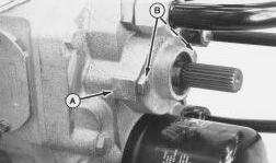 8. Install charge pump on transmission with flat surface (A) on left-hand side. Tighten two cap screws (B) to 37—50 N·m (27—37 lb-ft)