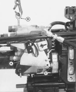 10. Install eyebolt (B) in threaded hole on top of hydro and attach overhead hoist. Take the slack out of the chain.