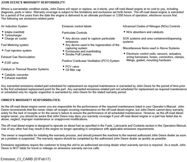 The California Air Resources Board (CARB) is pleased to explain the emission-control system warranty on 2016 through 2018 off-road diesel engines In California, new offroad engines must be designed, built and equipped to meet the State’s stringent anti-smog standards John Deere must warrant the emission control system on your engine for the periods of time listed below provided there has been no abuse, neglect or improper maintenance of your engine