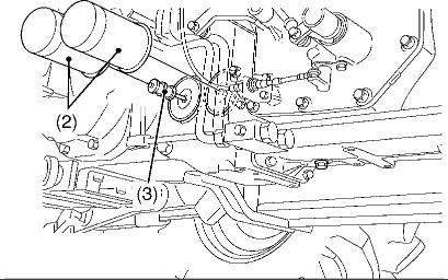 1. To drain the used oil, remove the drain plugs (2) at the bottom of the engine and drain the oil completely into the oil pan. All the used oil can be drained out easily when the engine is still warm.
