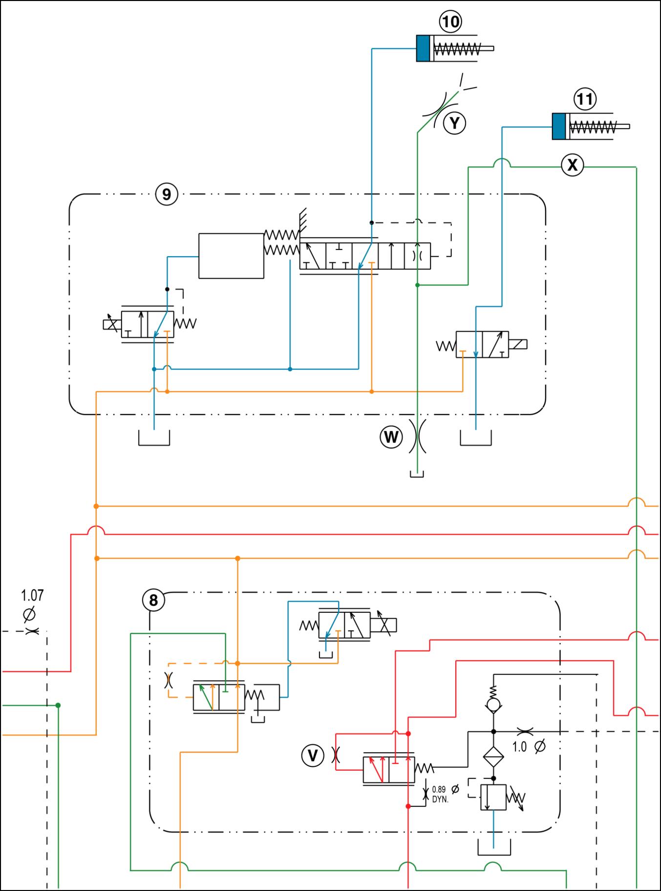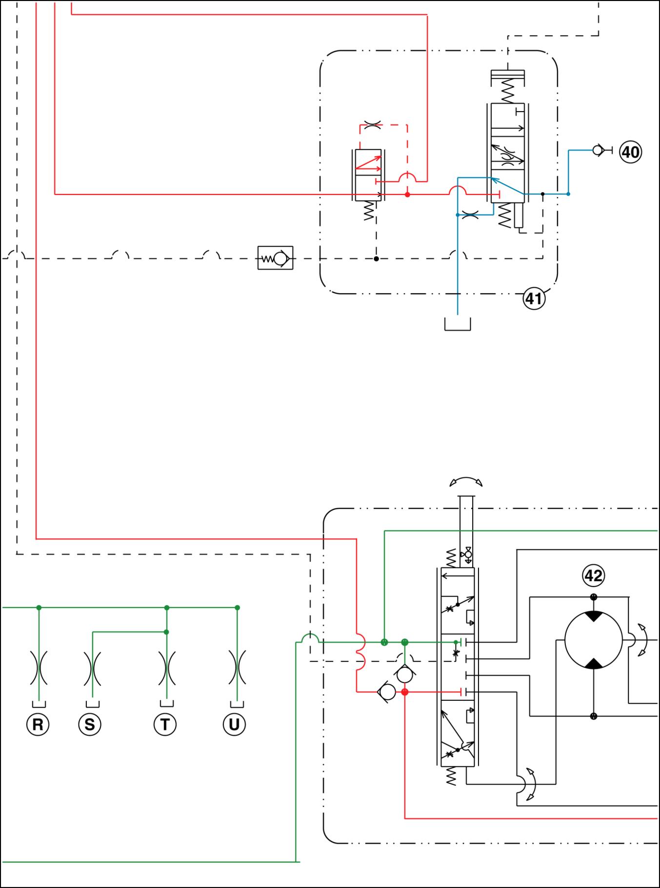 T8010 EEAA, T8010 WE, T8020 EEAA, T8020 WE, T8030 EEAA, T8030 WE, T8040 EEAA, T8040 WE Standard flow Pressure and flow compensating (PFC) pump Regulated circuit pump flow Charge/lube pump flow Return to tank/sump Megaflow pump 1. Hitch valve 28. Service brake L. Lube regulator/relief valve 2. Hitch cylinders 29. Steering hand pump M. Chassis ground 3. Power beyond manifold 30. Steering cylinders N. Bypass valve 4. Charge/lube pump 31. Park/emergency brake O. Odd/even lube 5. PFC pump 32. Brake release pump P. Drop box lube 6. Screen/compensator 33. Filter Q. Creep drive lube 7. Oil cooler 34. Suspension control valve R. Master clutch lube 8. Priority/regulator valve 35. Suspension axle cylinders S. Right hand brake/differential lube 9. PTO/differential lock valve 36. Speed housing T. MFD/range lube 10. PTO clutch brake 37. Autoguidance valve U. Left hand brake/differential lube 11. Differential lock clutch 38. PX sensor port V. Damping 12. Transmission control valves 39. Park brake valve W. Bevel pinion lube 13. MFD clutch 40. Trailer brake coupler X. Lube supply 14. Low clutch 41. Trailer brake priority valve Y. PTO clutch lube 15. Medium clutch 42. Manual geroter aa. Inlet 16. High clutch 43. Added geroter bb. To park brake valve solenoid 17. Reverse clutch 44. To trailer brakes cc. Switch opens when pedal reaches full stroke at hyd pressure loss 18. Fifth clutch A. Supply 19. Third clutch B. Tank dd. Pressure sensor – rod 20. First clutch C. Signal ee. Pressure sensor – piston 21. Even clutch D. Relief ff. Rod solenoid 22. Odd clutch E. Pilot supply gg. Piston solenoid 23. Creep or 50 km/h clutch F. Cylinder port hh. Rod 24. Park clutch G. Case drain jj. Piston 25. Master clutch H. Return kk. To regulated circuit 26. Master clutch inching valve J. Pilot drain nn. To lube 27. Brake valve K. Regulated pp. To brake valve