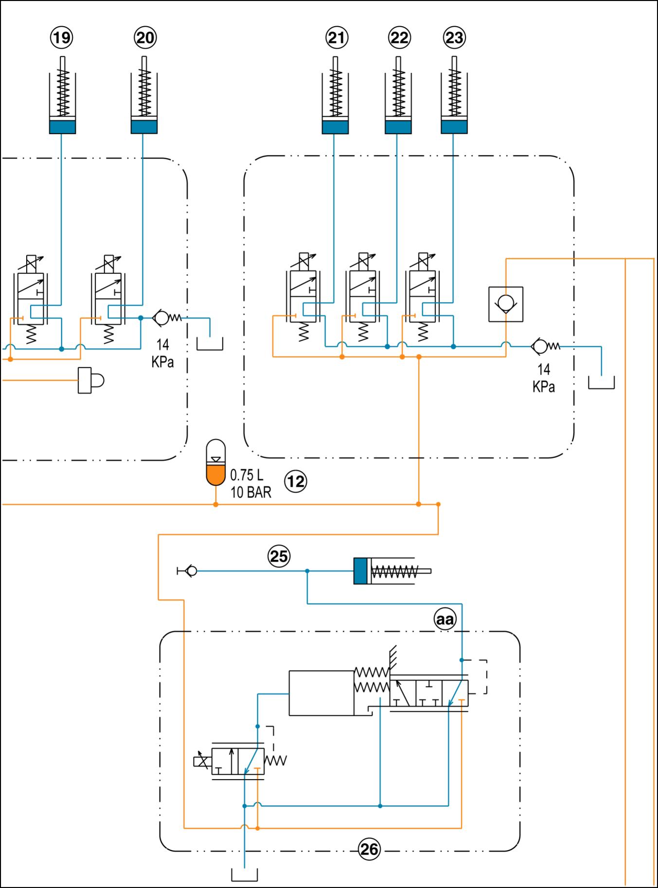 circuit pump flow Charge/lube pump flow Return to tank/sump Megaflow pump 1. Hitch valve 28. Service brake L. Lube regulator/relief valve 2. Hitch cylinders 29. Steering hand pump M. Chassis ground 3. Power beyond manifold 30. Steering cylinders N. Bypass valve 4. Charge/lube pump 31. Park/emergency brake O. Odd/even lube 5. PFC pump 32. Brake release pump P. Drop box lube 6. Screen/compensator 33. Filter Q. Creep drive lube 7. Oil cooler 34. Suspension control valve R. Master clutch lube 8. Priority/regulator valve 35. Suspension axle cylinders S. Right hand brake/differential lube 9. PTO/differential lock valve 36. Speed housing T. MFD/range lube 10. PTO clutch brake 37. Autoguidance valve U. Left hand brake/differential lube 11. Differential lock clutch 38. PX sensor port V. Damping 12. Transmission control valves 39. Park brake valve W. Bevel pinion lube 13. MFD clutch 40. Trailer brake coupler X. Lube supply 14. Low clutch 41. Trailer brake priority valve Y. PTO clutch lube 15. Medium clutch 42. Manual geroter aa. Inlet 16. High clutch 43. Added geroter bb. To park brake valve solenoid 17. Reverse clutch 44. To trailer brakes cc. Switch opens when pedal reaches full stroke at hyd pressure loss 18. Fifth clutch A. Supply 19. Third clutch B. Tank dd. Pressure sensor – rod 20. First clutch C. Signal ee. Pressure sensor – piston 21. Even clutch D. Relief ff. Rod solenoid 22. Odd clutch E. Pilot supply gg. Piston solenoid 23. Creep or 50 km/h clutch F. Cylinder port hh. Rod 24. Park clutch G. Case drain jj. Piston 25. Master clutch H. Return kk. To regulated circuit 26. Master clutch inching valve J. Pilot drain nn. To lube 27. Brake valve K. Regulated pp. To brake valve