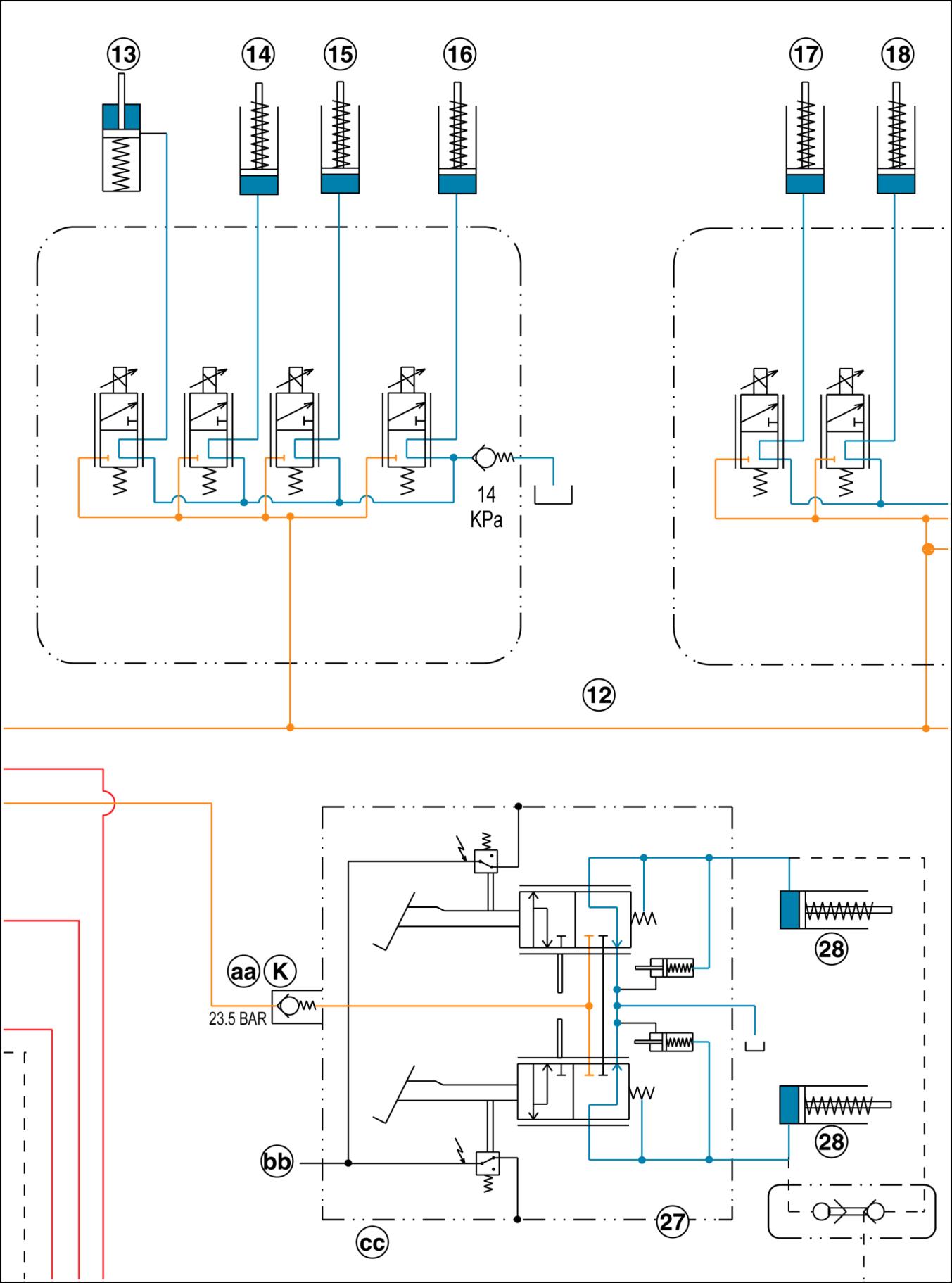 and flow compensating (PFC) pump Regulated circuit pump flow Charge/lube pump flow Return to tank/sump Megaflow pump 1. Hitch valve 28. Service brake L. Lube regulator/relief valve 2. Hitch cylinders 29. Steering hand pump M. Chassis ground 3. Power beyond manifold 30. Steering cylinders N. Bypass valve 4. Charge/lube pump 31. Park/emergency brake O. Odd/even lube 5. PFC pump 32. Brake release pump P. Drop box lube 6. Screen/compensator 33. Filter Q. Creep drive lube 7. Oil cooler 34. Suspension control valve R. Master clutch lube 8. Priority/regulator valve 35. Suspension axle cylinders S. Right hand brake/differential lube 9. PTO/differential lock valve 36. Speed housing T. MFD/range lube 10. PTO clutch brake 37. Autoguidance valve U. Left hand brake/differential lube 11. Differential lock clutch 38. PX sensor port V. Damping 12. Transmission control valves 39. Park brake valve W. Bevel pinion lube 13. MFD clutch 40. Trailer brake coupler X. Lube supply 14. Low clutch 41. Trailer brake priority valve Y. PTO clutch lube 15. Medium clutch 42. Manual geroter aa. Inlet 16. High clutch 43. Added geroter bb. To park brake valve solenoid 17. Reverse clutch 44. To trailer brakes cc. Switch opens when pedal reaches full stroke at hyd pressure loss 18. Fifth clutch A. Supply 19. Third clutch B. Tank dd. Pressure sensor – rod 20. First clutch C. Signal ee. Pressure sensor – piston 21. Even clutch D. Relief ff. Rod solenoid 22. Odd clutch E. Pilot supply gg. Piston solenoid 23. Creep or 50 km/h clutch F. Cylinder port hh. Rod 24. Park clutch G. Case drain jj. Piston 25. Master clutch H. Return kk. To regulated circuit 26. Master clutch inching valve J. Pilot drain nn. To lube 27. Brake valve K. Regulated pp. To brake valve