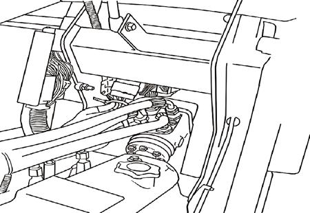 —Connectthetwoflexiblepowersteeringpipesto theunionontheleft--handsideofthefrontaxle. Securethetwopipeswiththespecialclampand screwtheclamptothetractor.