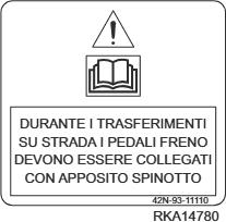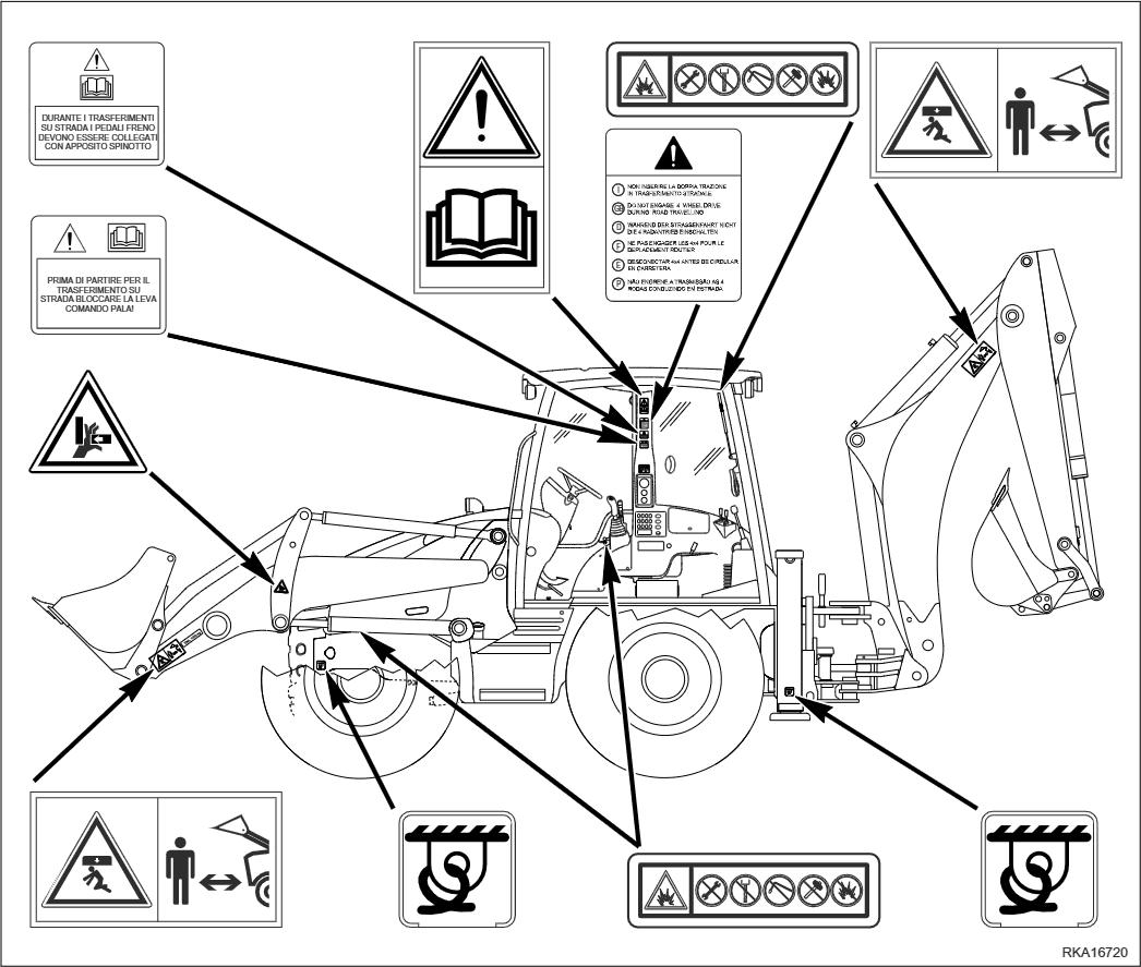 • The machine can travel on roads only if equipped with suitable lighting, signalling and safety devices and if this type of use is authorized by the logbook. Before travelling on roads, make sure that the equipment with which the machine is provided is homologated and that the safety locks are correctly engaged.