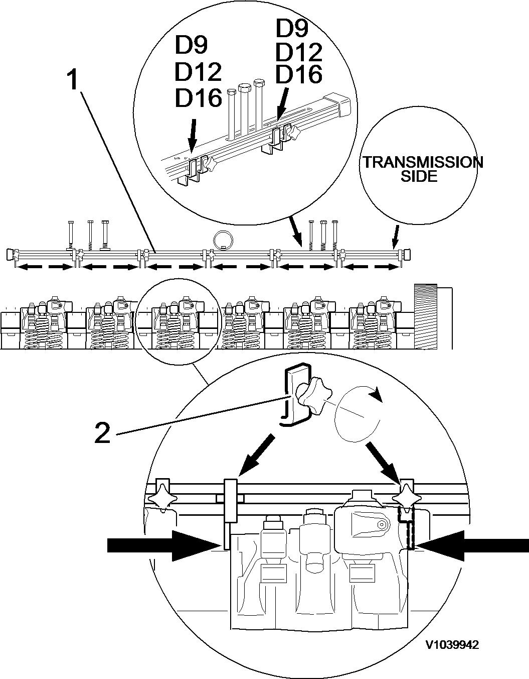 15. Install the rocker arm bridge with the lifting tool 9990185. Tighten the bolts along the whole rocker arm shaft to prevent warping and to make sure that the guide pins fit in the camshaft's support bearing. See 214 Rocker arm shaft, tightening torques
