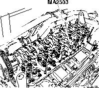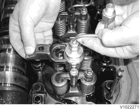 10. Loosen the bolts for the rocker arm bridge equally in sequences, so that the rocker arm shaft is not bent. Remove the bolts and carefully lift away the rocker arm bridge with 9990185 and 88880003.