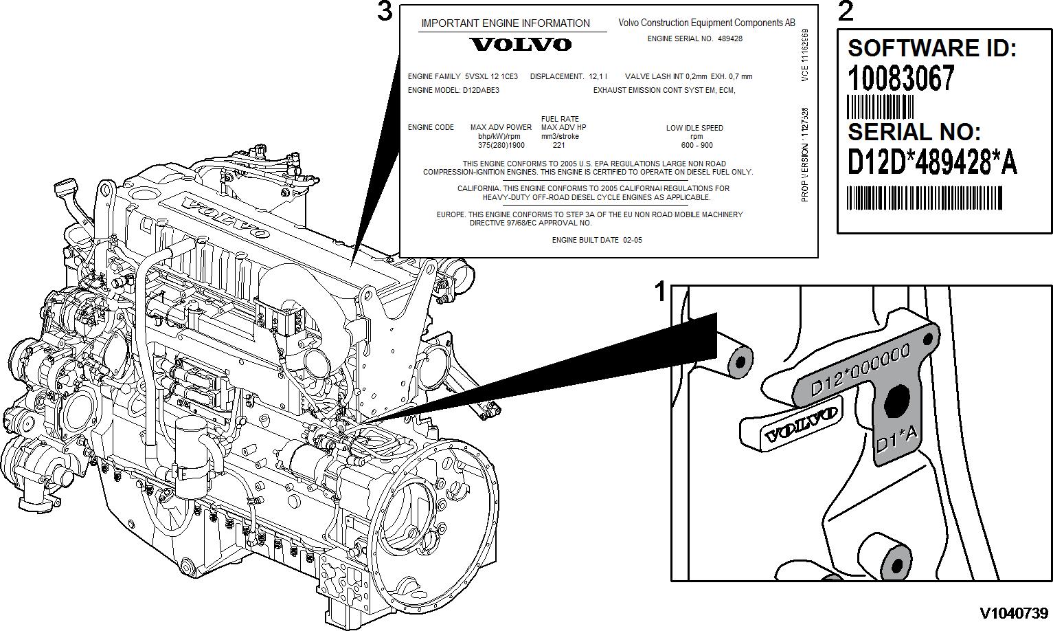 Engine D12 is available in two versions, D12C and D12D. See the product plate for the machine regarding which engine version applies to the machine.