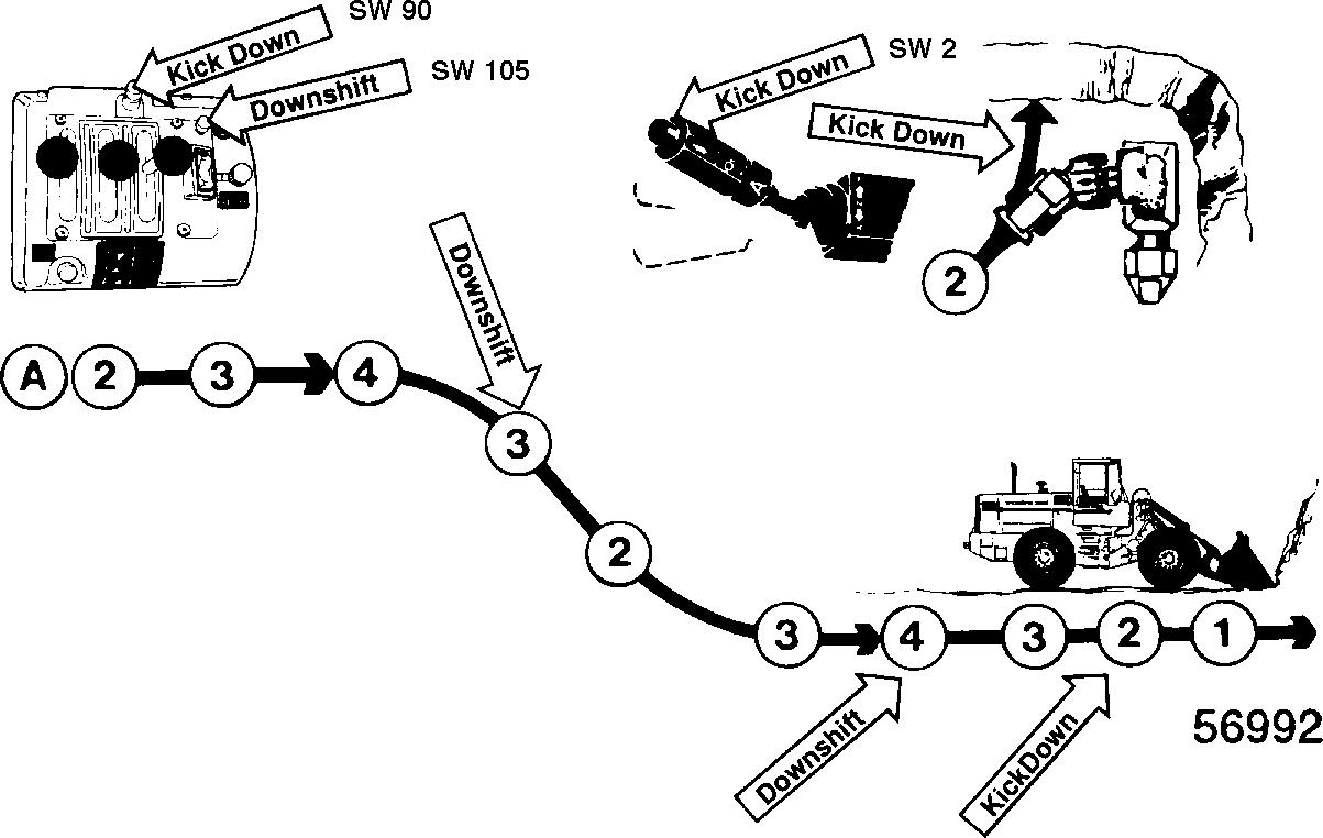 With the aid of switch SW105 the operator can achieve immediate downshifting in order to retard (brake) the machine. When SW105 is activated, current is supplied to ECU connection EB14 and downshifting takes place as shown below.