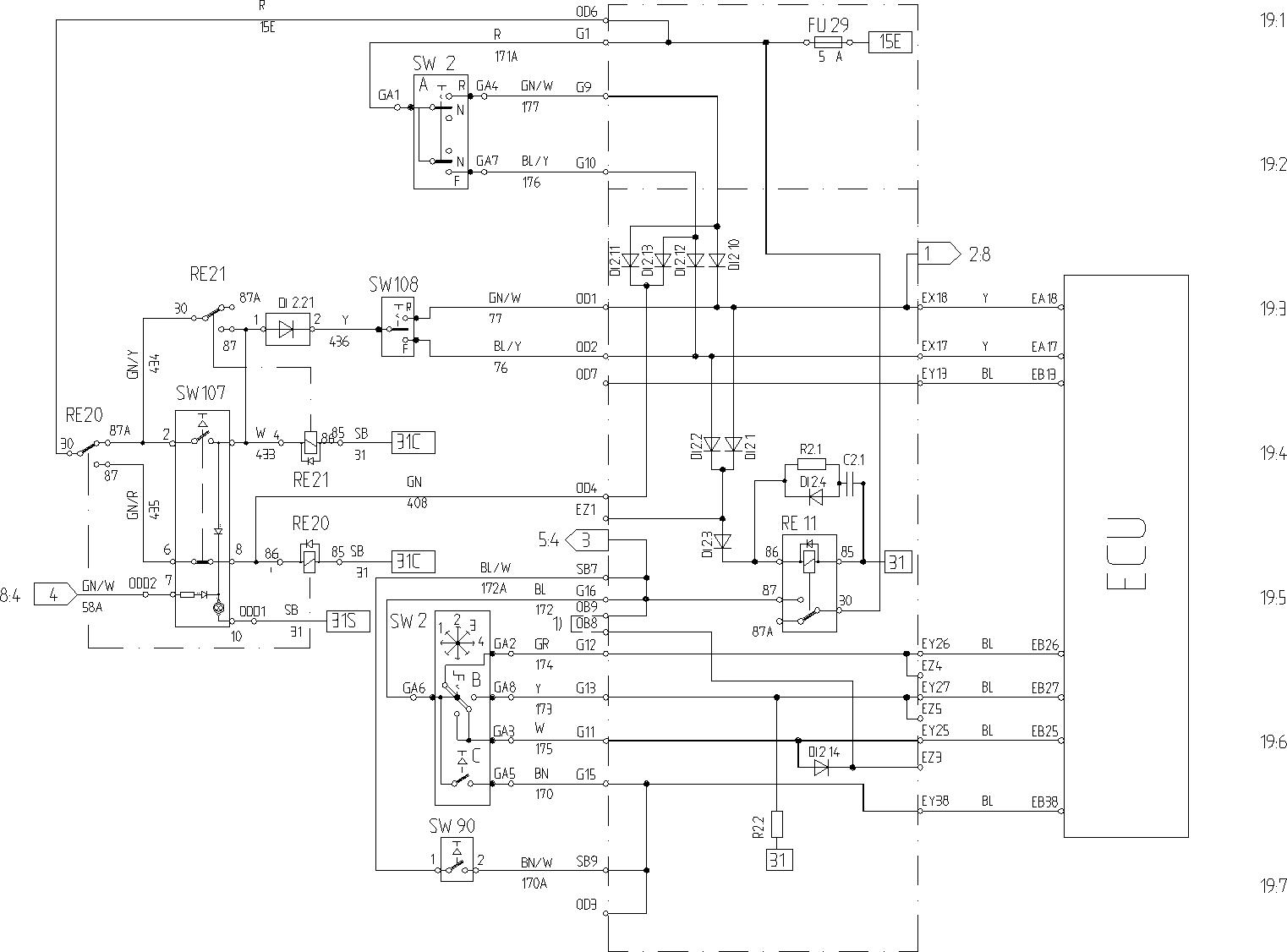 Switch SW108 now receives current via relay RE20 (30 – 87A), relay RE21 (30 – 87) and diode Di 2.21.