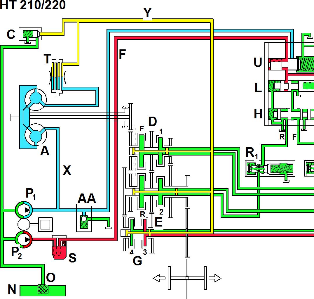 At low speed a change of direction takes place in 2nd gear and at higher speed in 3rd gear and downshifting to 2nd only takes place when the machine has stopped and before it begins to move off in the opposite direction.