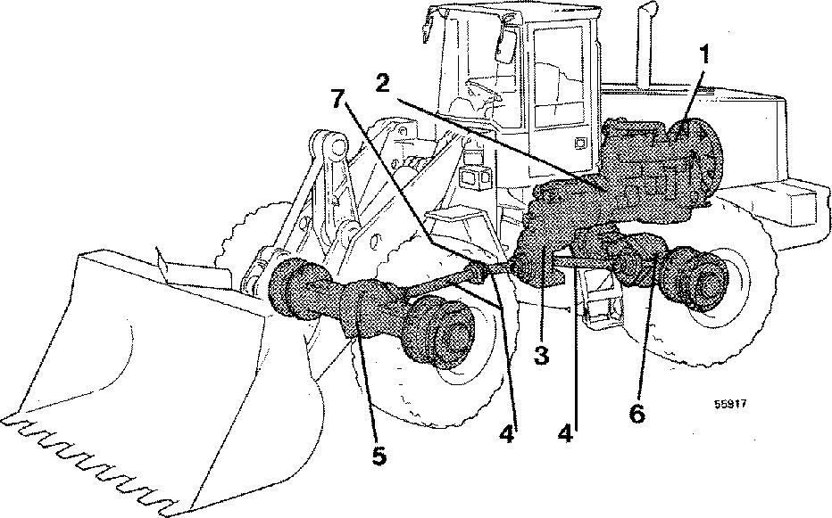 The engine output torque is transferred to the transmission via the torque converter. The converter has a fixed stator. The stator multiplies the torque. The multiplication is at its greatest when the engine is running at high speed and the turbine rotor is stationary, e.g. when starting the machine. The torque from the torque converter passes through the transmission and dropbox to the drive axles. In the differential gear the torque is divided out to the planetary hub gears and the wheels. The transmission has four speed gears and two directional gears.