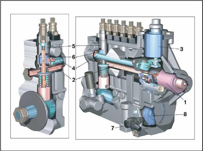 The injection pump is bolted onto a separate bracket on the left side of the engine.The injectors (1) used are made by Bosch. Their opening pressure is adjusted by means of washers of varying thickness inserted above the spring.