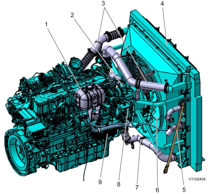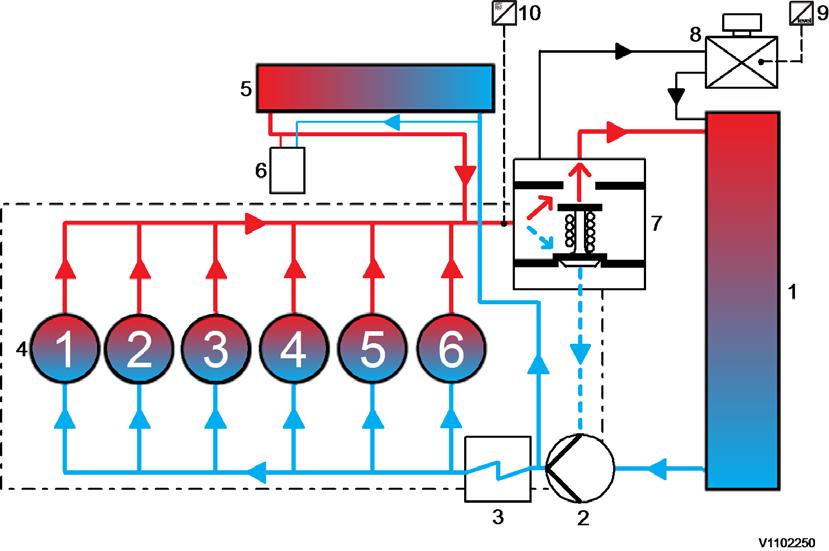 The coolant pump delivers the coolant to the engine via the lubrication oil cooler and into the engine, around the cylinder liners and through the thermostat housing. The thermostat controls the coolant's flow out to the radiator or in by-pass flow