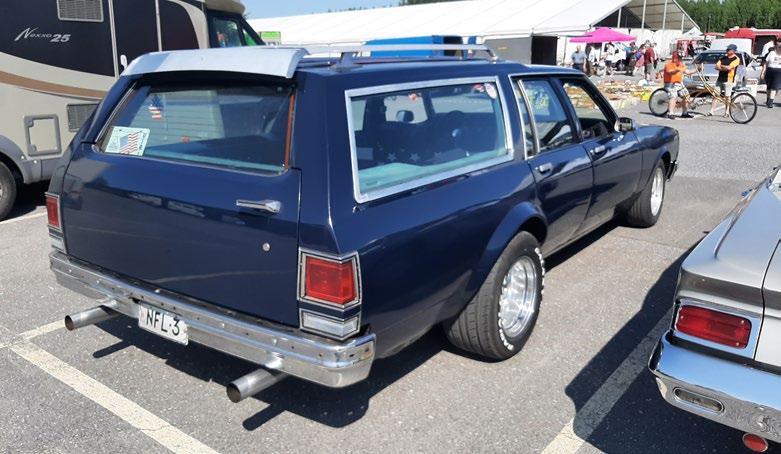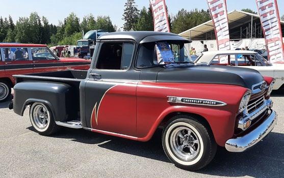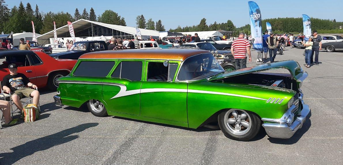 Severi Koivuniemi saapui Huittisista tällä makealla Chevrolet Brookwood 1958 -mallilla. Autoon on asennettu LS1-moottori ja ilma-alusta, mikä tekee siitä erinomaisen kesäajeluun. Pirteä väri erottui joukosta.