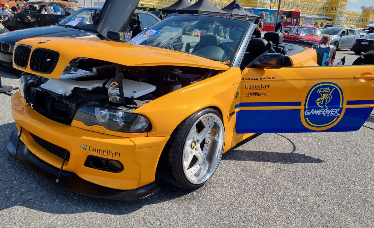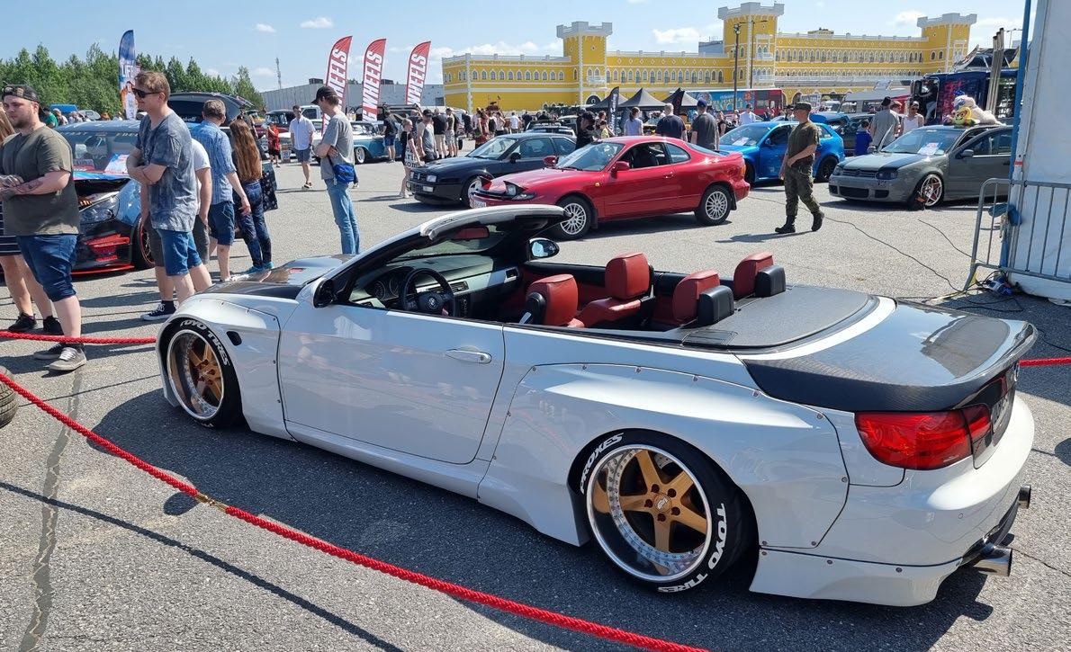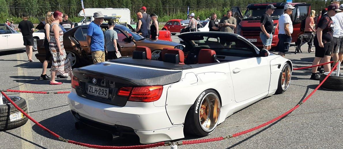 Paikanpäälle saapui runsaasti päivän mittaan autoja Drive In -tyyliin, kuten tämä tyylikkäästi stailattu ja rakennettu Tuomas Pataman BMW 330d Pandem cabrio vm. 2008.