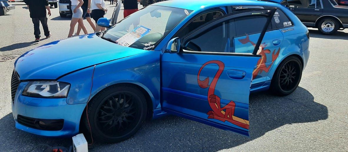 Seinäjokelaisen Sebastian Oksaharjun Audi A3 vuodelta 2010. Erikoismaalattu, hifijärjestelmä, teippaukset ja lasikuitu helmat.