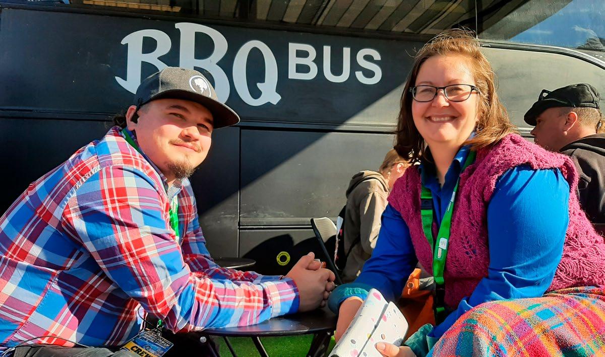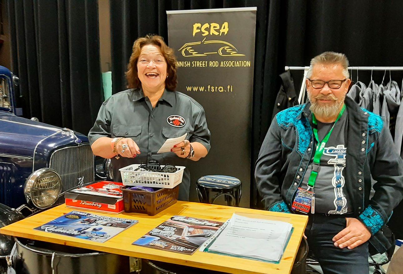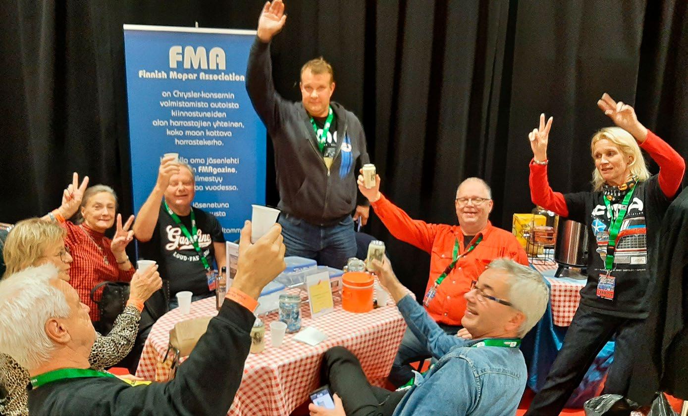 FMA- Finnish Mopar Association Ry:n osastolla kerhon puh.johtaja Olli ja sihteeri Erja opastivat kansainvälisiä vieraitamme miten korkealle Suomessa kippis-kuppi täytyy nostaa. Kahviakin oli tarjolla.
