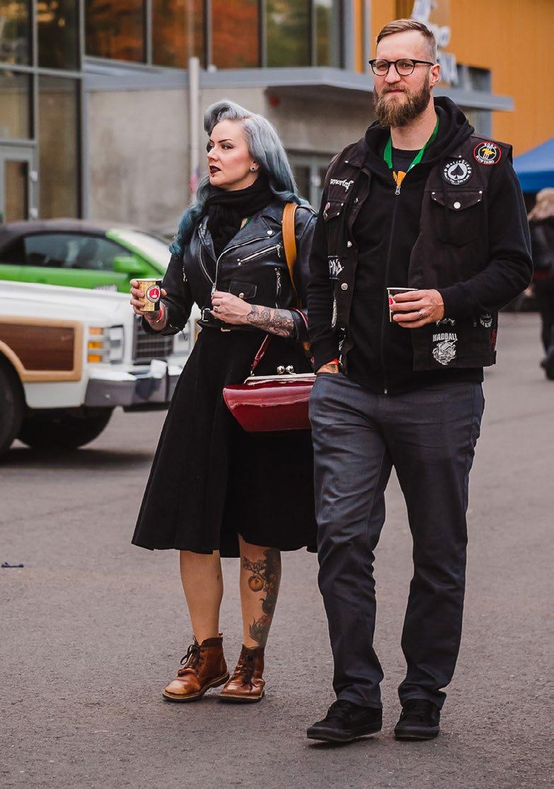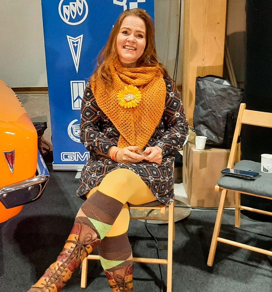 Riikka edusti kerhon osastolla autojen sävyihin ja vuosimalleihin sopivalla lookilla.