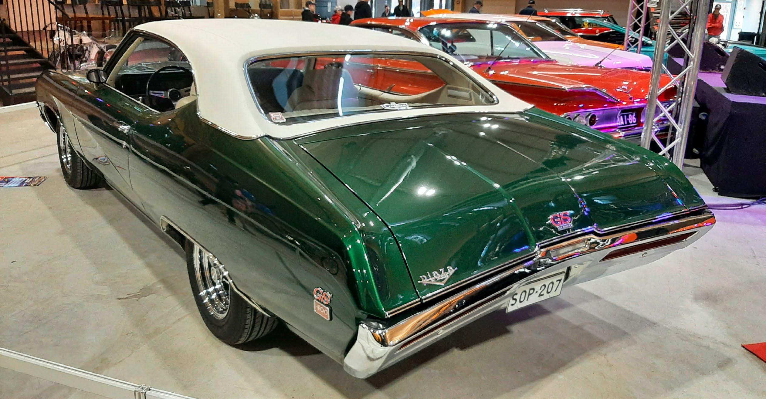 Ari Lehtolan Buick GS 400 1969 Kanadan tuonti. Mallia tehtiin sekä USA:ssa että Kanadassa, erona ainoastaan perä. Myyty aikoinaan Ruotsiin uutena. Auto entisöity -94 ja on upeassa kunnossa. Vastaavia on tehty noin 600 kpl ja -69 kovakattoista noin 630.