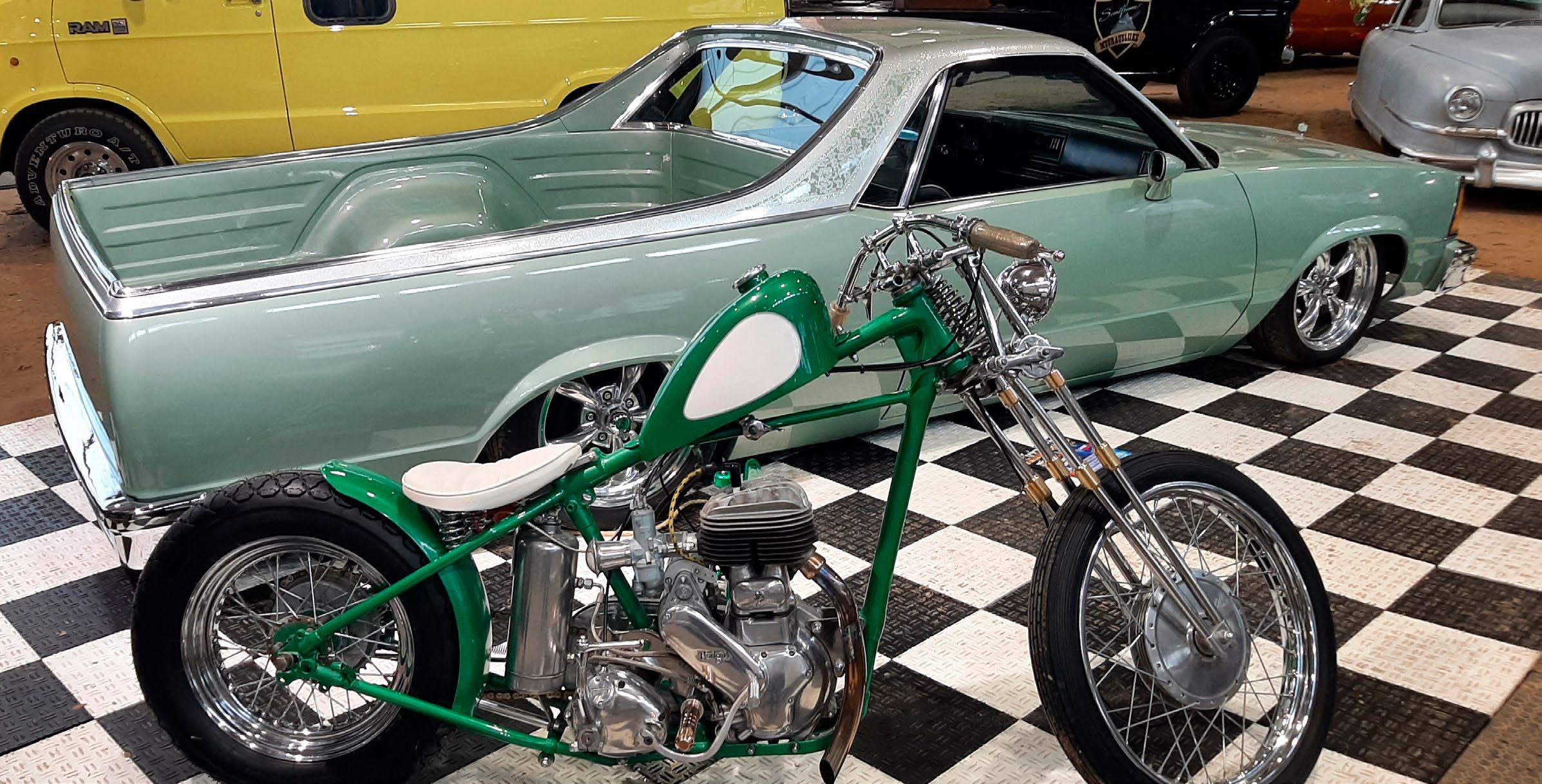 Chevrolet El Caminolla sekä Norton 16H 1951 moottoripyörällä. Mies palkittiin Top 10 –rakentaja –luokassa.