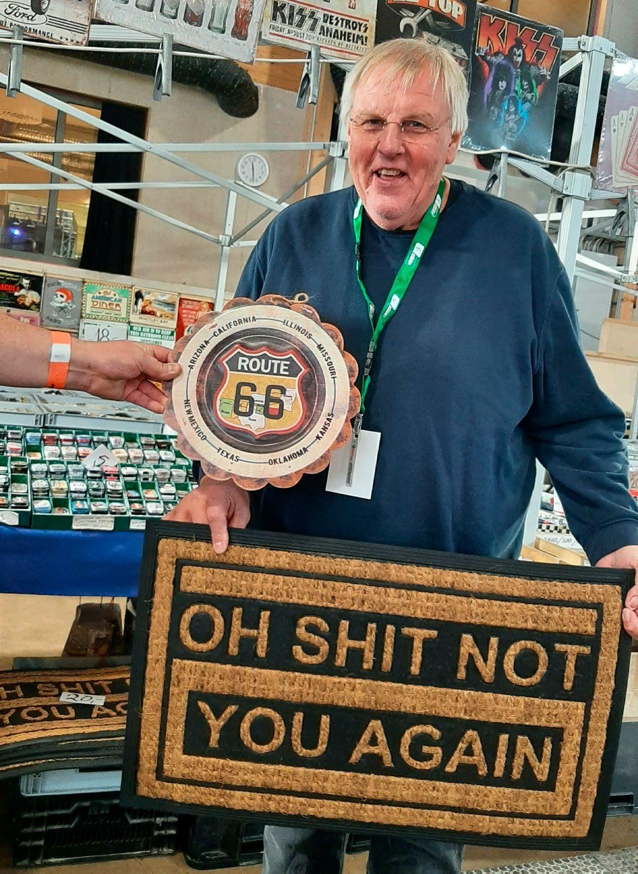 Juhani katseli tutun valtatie Route 66 - kylttiä, mutta kameramiehen osuessa paikalle, löytyi osastolta oleva kynnysmatto nopeasti miehen käsiin. Juhani on huumorimiehiä.