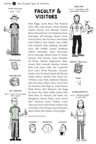 Peter Bagge, Lynda Barry, Nick Bertozzi, Harry Bliss, Kate Beaton, Alison Bechdel, Stephen Bissette, Ivan Brunetti, Charles Burns, Howard Cruse, Jon Chadurjian, Farel Dalrymple, Jeff Danziger, Eleanor Davis, Vanessa Davis, Tom De Haven, Kim Deitch, Scott Dikkers, Evan Dorkin, Jules Feiffer, Tom Gammill, Myla Goldberg, Meredith Gran, Bill Griffith, Sammy Harkham, Gilbert Hernandez, Jaime Hernandez, Kevin Huizenga, Miriam Katin, R. Kikuo Johnson, Paul Karasik, James Kochalka, Ed Koren, Michael Kupperman, Hope Larson, Rick Leonardi, Jonathan Lethem, Kelly Link, Jason Little, Alec Longstreth, Jason Lutes, David Macaulay, Françoise Mouly, Scott McCloud, Patrick McDonnell, Anders Nilsen, Michelle Ollie, Bryan Lee O’Malley, Laura Park, Katherine Paterson, John Porcellino, Hilary Price, Kevin Pyle, Joe Quinones, Ron Regé, Jr., Aaron Renier, Paolo Rivera, Alex Robinson, Jim Rugg, Joe Sacco, Stan Sakai, Gabby Schulz, Seth, Dash Shaw, R. Sikoryak, Jeff Smith, Art Spiegelman, Barron Storey, James Sturm, Rich Tommaso, Garry Trudeau, Carol Tyler, Sara Varon, Rick Veitch, Charles Vess, Chris Ware, Drew Weing, Lauren Weinstein, Maris Wicks, Mo Willems, Chris Wright Faculty in italics