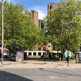 Feels unsafe, a bit dark and lots of people hanging around in the evening. Used as a congregation area for delivery drivers and for customers at the bars that overlook the square. Feels dirty, unwelcoming and sometimes unsafe.