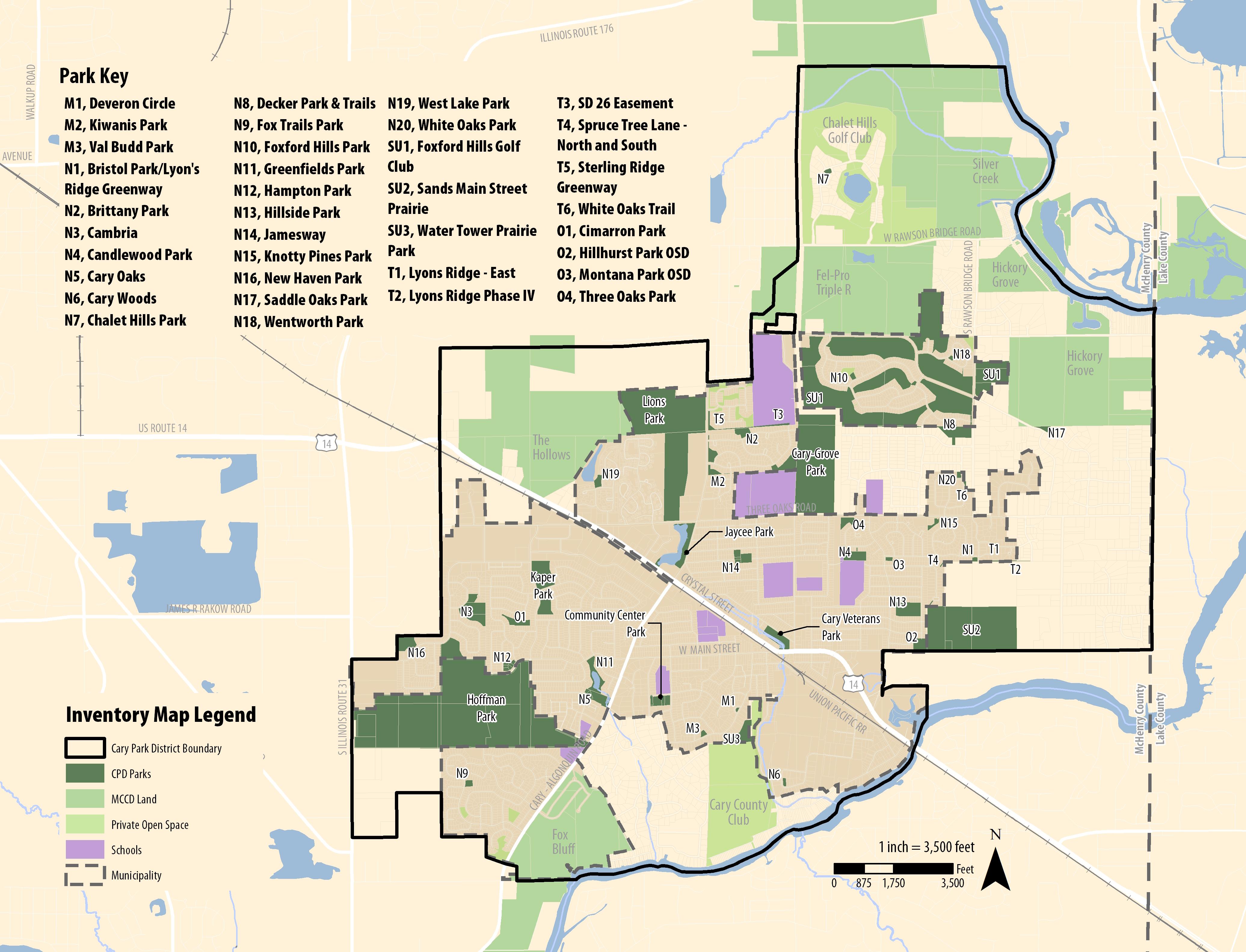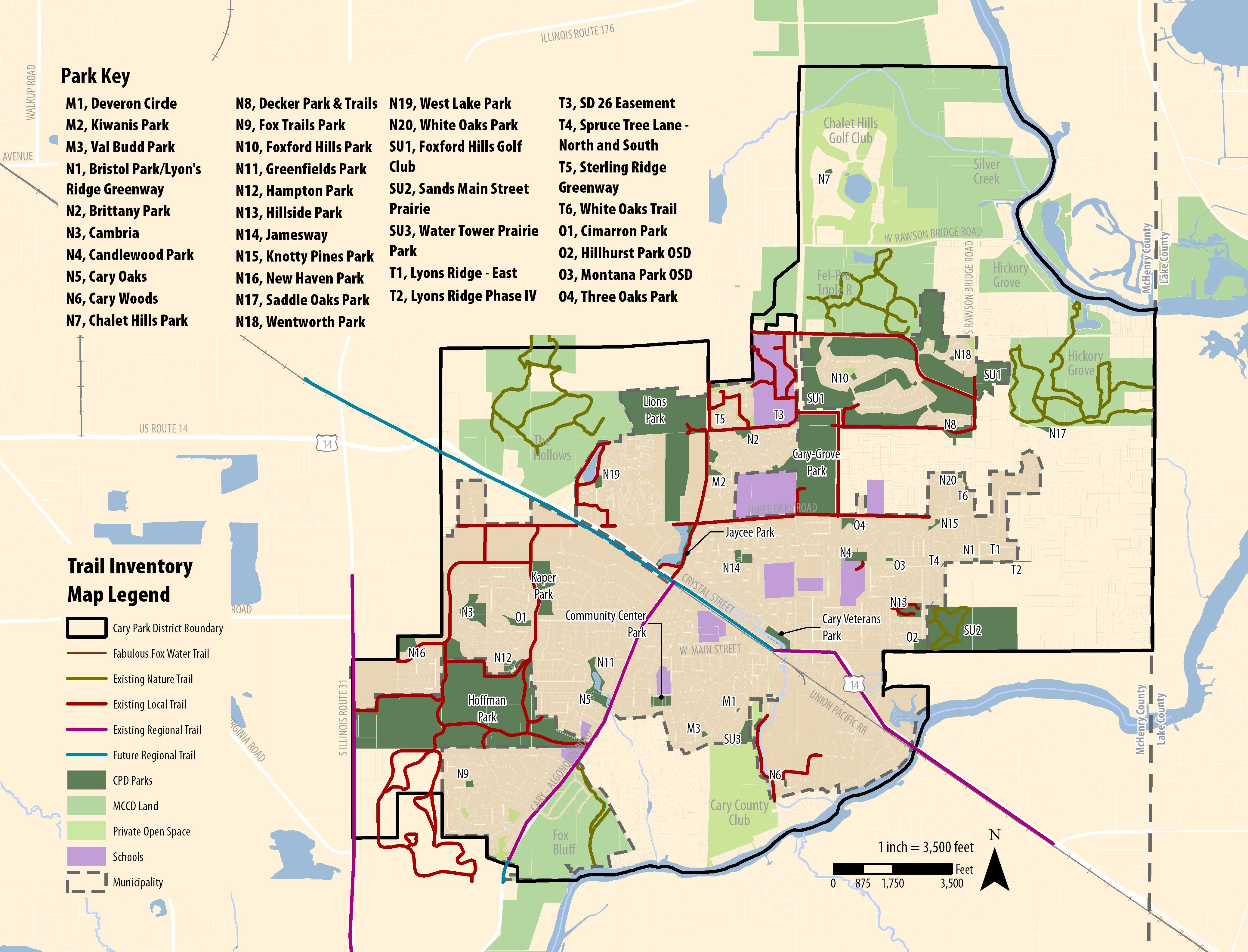 The Northwest Tollway (Interstate 90) is 15 miles south of Cary, with ingress and egress ramps located between Dundee and Elgin. U.S. Route 14 (Northwest Highway) bisects the Park District on northwest/southeast axis. McHenry County Route V36 (Cary-Algonquin/Silver Lake Road) is the principle north/south route through the Park District. Illinois Route 31 forms a portion of the Park District’s western boundary at Hoffman Park. West Main Street, Three Oaks Road, Crystal Lake Road and Rawson Bridge Road are other major roadways that link Park District facilities.