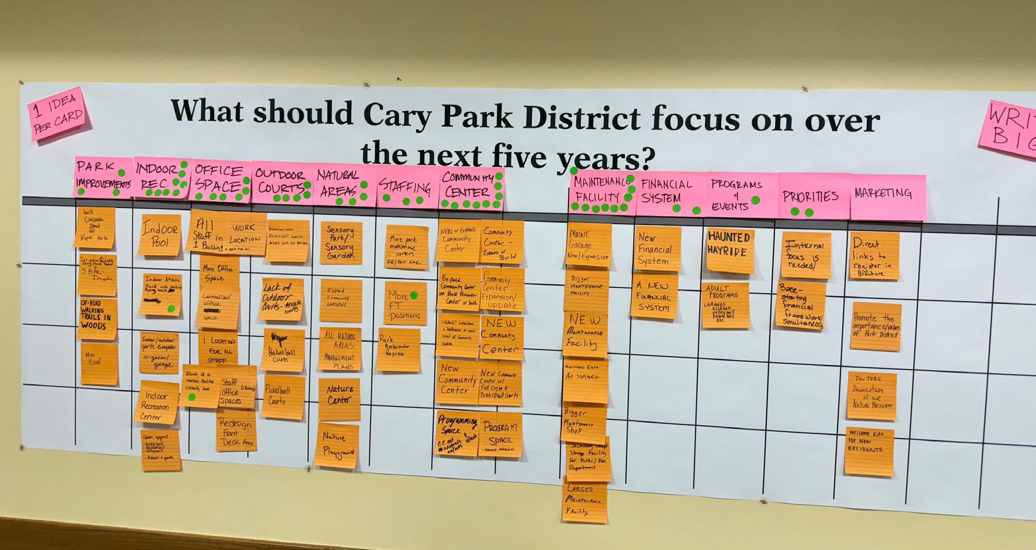 Items Discussed: Participants were given a notecard and asked to write down all their comments and suggestions for what the Cary Park District should focus on over the next 5 to 10 years relating to parks , facilities. They then selected their top t wo to write down on sticky notes. HDG facilitated organizing the responses into the following categories and had the participants vote on the items most important to them: