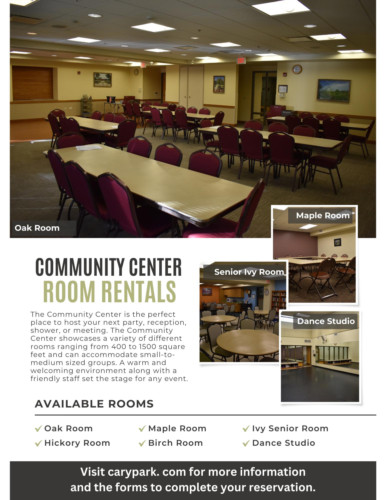 Visit the Community Center anytime we are open. The Community Center is located at 255 Briargate Road, Cary.