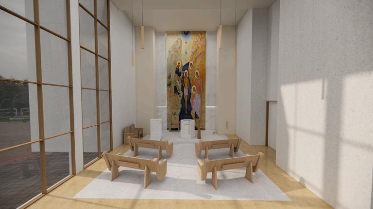 Applying cove ceilings decoratively creates an illusion of height that is considered dignified yet powerful with an intuition of the church's festivities The chosen materials, such as light oak finewood, limewash paint, marble slab, and polished porcelain tiles, effectively give the interior a surface of texture and finishes In contrast, the color scheme is in a neutral multitude of colors, such as white, light brown, beige, and cream, with a detailed addition of mixed gold. These improve the ambiance, creating a quality church for service and worship
