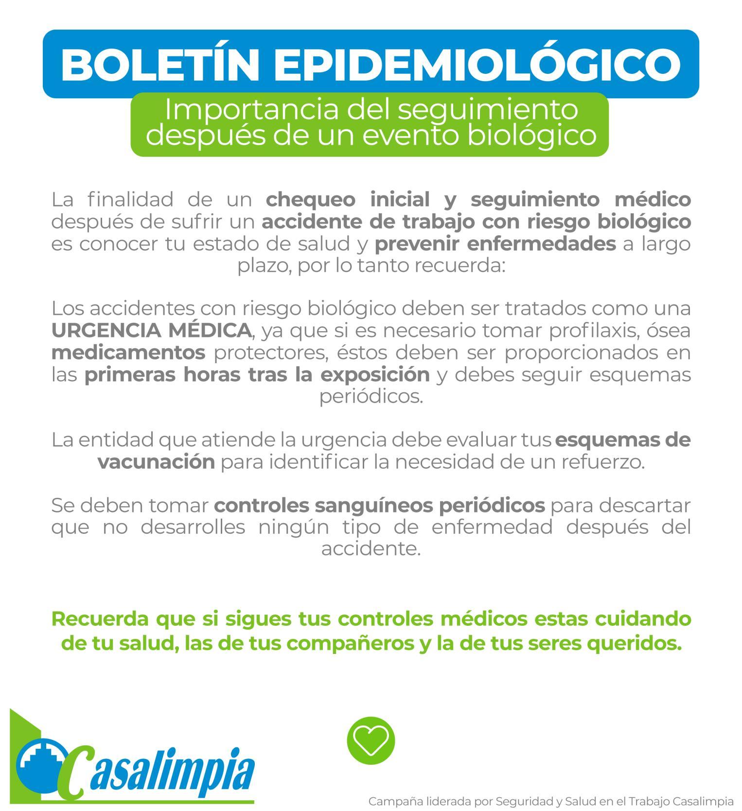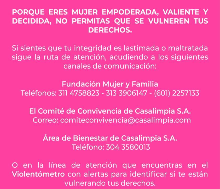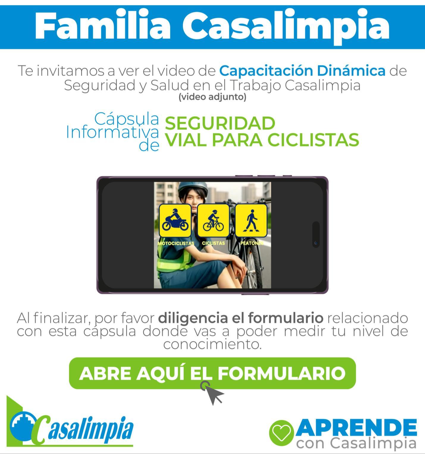En Casalimpia estamos con mi equipo, un equipo interdisciplinario y altamente calificado dedicados a prevenir accidentes y lesiones, para guiar a los trabajadores en estos pasos, pero necesitamos de cada uno de ustedes porque así todos somos un mismo equipo, al final del día tenemos un objetivo en común, desde el presidente de la empresa hasta el colaborador de aseo, volver sanos a casa con nuestros seres amados, por eso debemos participar constante y conscientemente en la seguridad y salud en el trabajo.