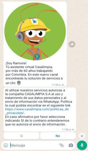 Ramona nuestra asistente virtual Casalimpia, cuenta con diversas funciones como: brindar atención las 24 horas del día, suministrar información de interés, generar certificaciones y facilitar la comunicación interna.