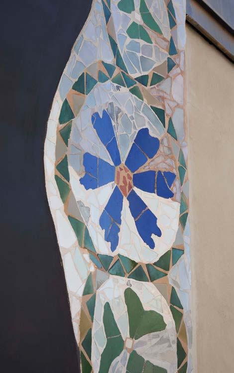 El trencadís está presente en la fachada y en el muro del patio. Para restaurar fielmente este puzzle de miles de piezas, se ha partido de escaneos en alta resolución e imágenes de archivo.