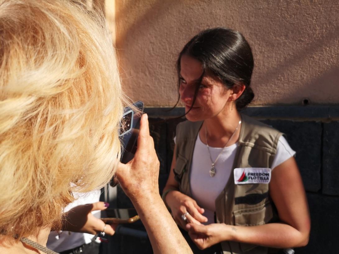 Madleen, mentre raccoglievano aiuti umanitari da portare a Gaza, presidiavano il piccolo porto assieme alle persone che li avevano raggiunti senza risparmiarsi un attimo dal parlare con gli intervenuti per sensibilizzare sulla tragedia che sta vivendo il popolo palestinese a Gaza, rispondere alle domande che gli si facevano. Tranne qualcuno che parlava spagnolo, la maggior parte di loro si esprimeva in inglese e l’operatrice culturale, Samia, una tunisina trapiantata a Catania, instancabilmente traduceva. L’atmosfera era entusiasmante, ricca di emozioni. Suggestiva e coinvolgente. Ognuno dei presenti si sentiva protagonista, contento di fare qualcosa per una comunità. Nel frattempo ammiravano alcuni attivisti che sulla spiaggia del porticciolo fa-