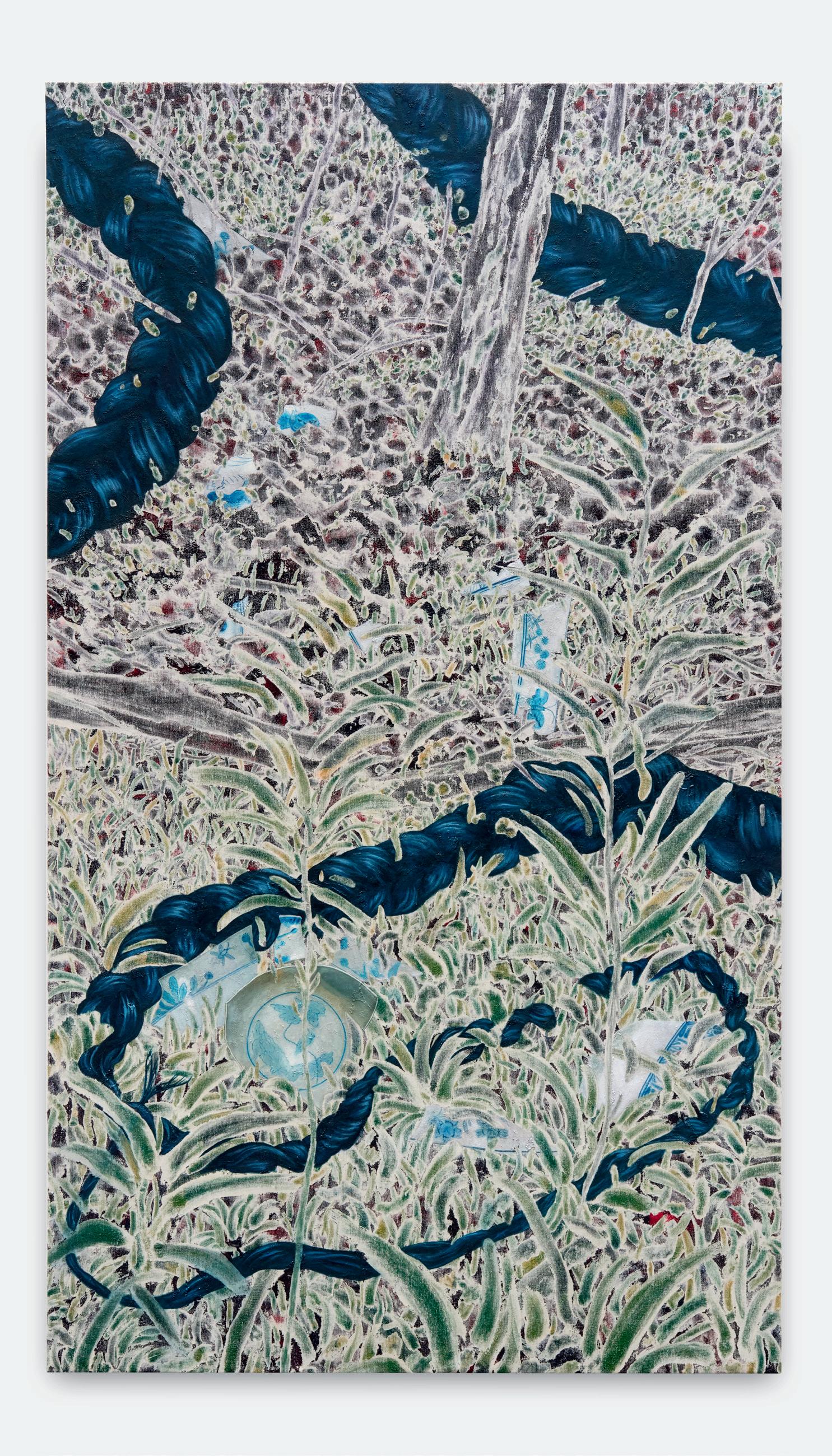 in a vertical painting Migration Towards West, Ho depicts a queue, a long braid that Chinese men wore during the Qing dynasty (1644-1911), snaking through grass. Its length is exaggerated and almost threateningly animalistic, as if shaped by racial animus towards exotic “Oriental” style. Lying in the same thicket are the broken shards of a plate that allude to how Robinson met his demise. While performing a notorious magic trick in which he was supposed to catch a bullet in a porcelain dish, the gun fired a real bullet into his lung.