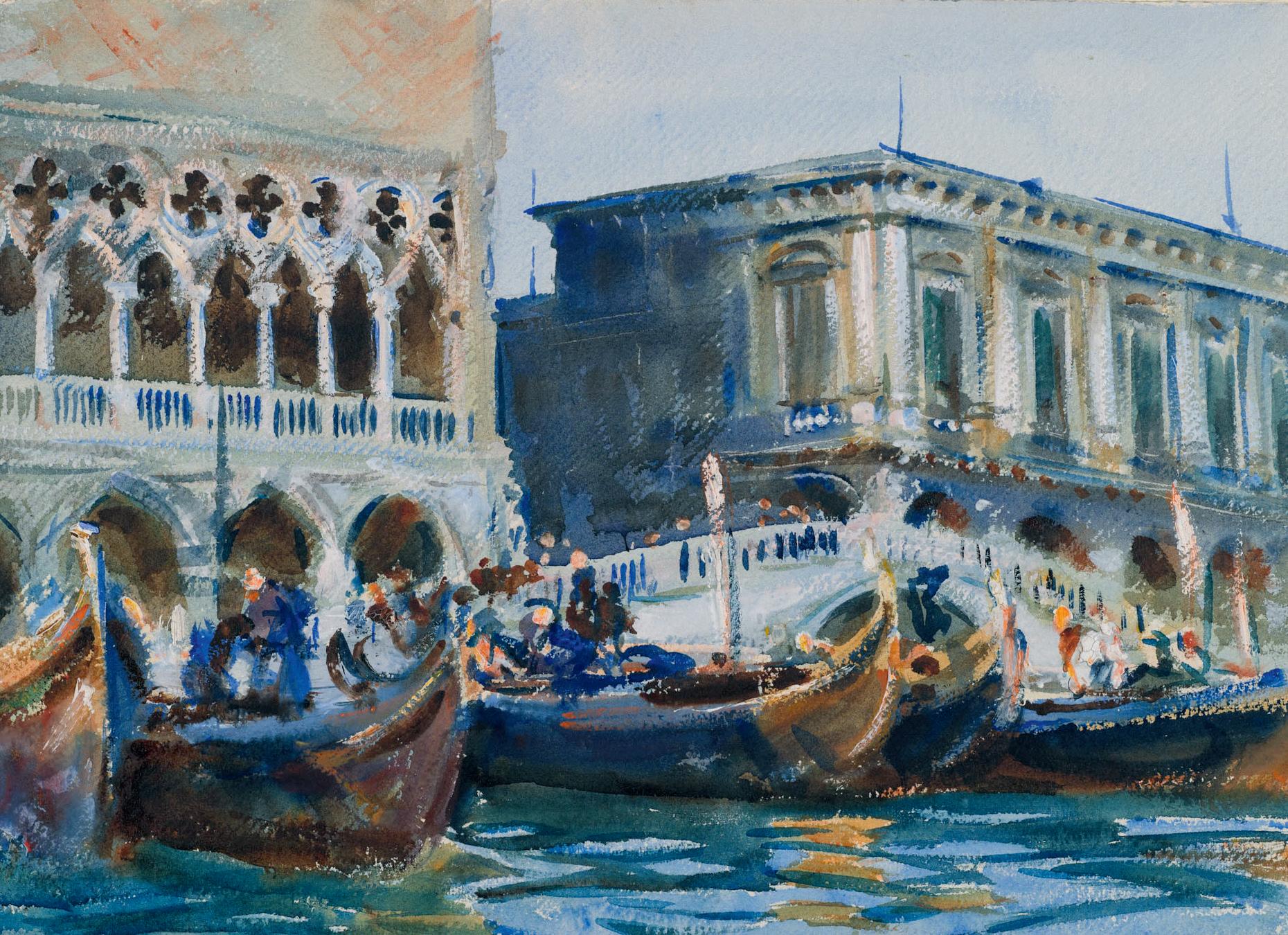 The Museum’s own Palazzo Ducale—acquired in 1920 in a strikingly early recognition of the value of modern French art—anchors the show. It sits alongside canvases of San Giorgio Maggiore, Palazzo Dario, and other facades rendered not as architectural elevations but as spectrums of light, their contours wavering in reflection. Complementing Monet’s dissolving façades are John Singer Sargent’s Venetian watercolors, including La Riva (1903–4) and Santa Maria della Salute (1904), where the American painter captured the flash of movement and glimmer of water with a swiftness that mirrors Monet’s own fascination with evanescence. Unlike the bustling markets and gondola-filled canals of Canaletto,
