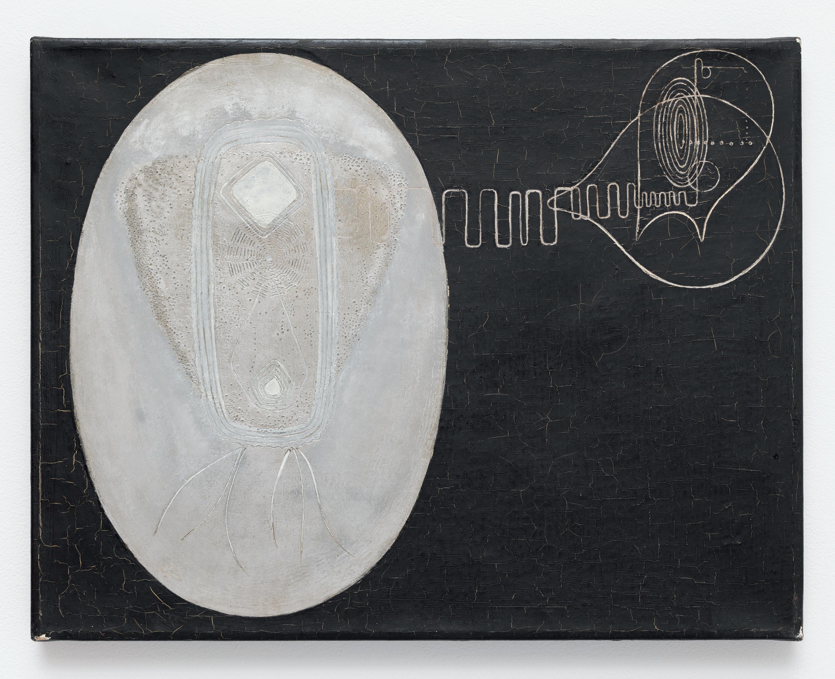 If Brown’s painting speaks of theater, Wallace Berman’s Hermetic Image (1961) conjures another register of the surreal: the mystical diagram. The work is filled with esoteric words and symbols that recall alchemical manuscripts. At a moment when mainstream religion seemed increasingly hollow, Berman and others turned toward occult practices, non-Western cosmologies, and