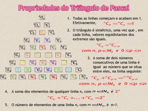 2. O triângulo é simétrico, uma vez que , em cada linha, valores equidistantes dos extremos são iguais.
