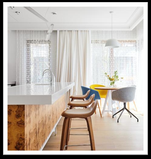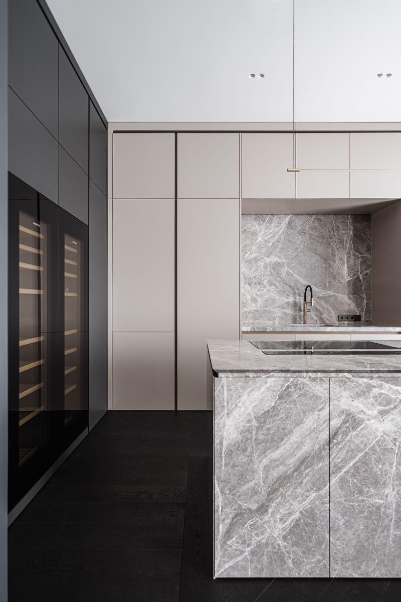 The complete absence of secondary partition trussed walls in the main area of the apartment, living and kitchen visually expands the space, creating an element of disengagement in the placement of all the constituent interior elements The main accent of the nude kitchen is in finishing the main zone and the island with natural Silver Roots stone. River stone is used in the surfaces and island facing of the guest bathroom