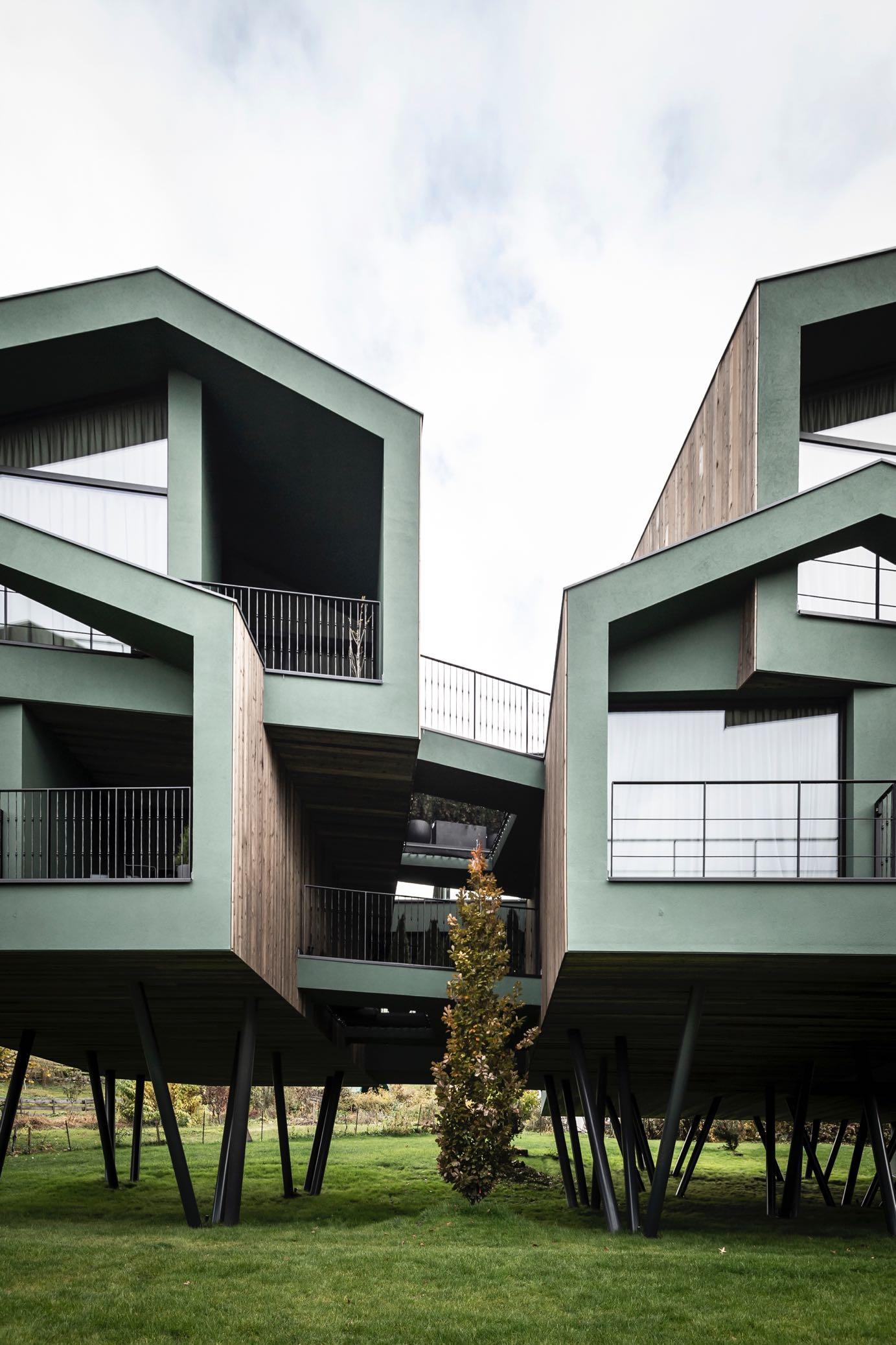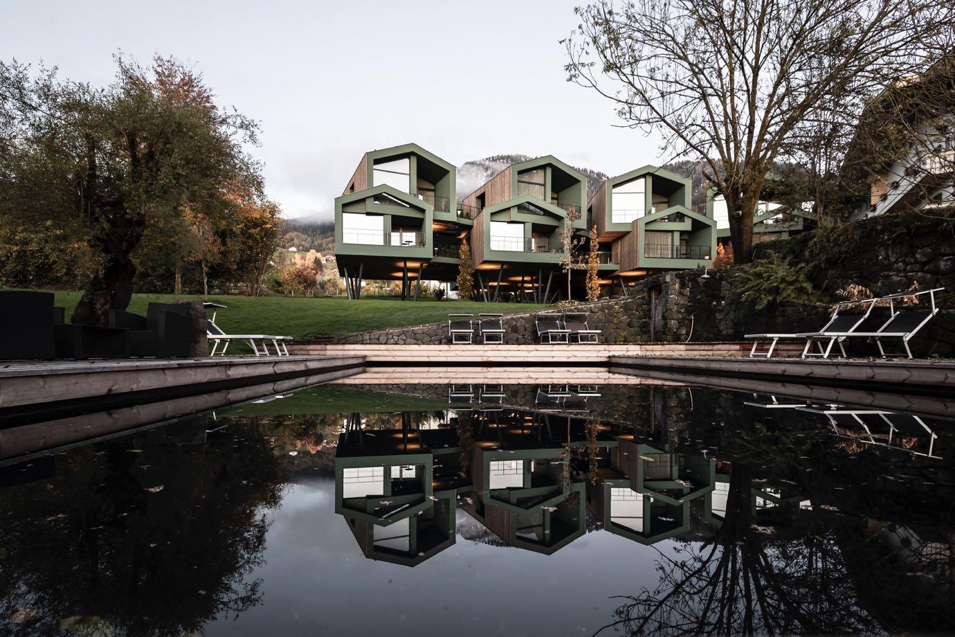the central theme of the architecture, thoroughly embedding the building within the nature, as if it had always been there. The intellectual concept of tree houses began to take shape: at the end of the connecting walkway that forms the backbone of the new development is the two-storey structure containing the suites, with five rooms on each floor, all of which have views over the park . In order to make the architectural complex even more dynamic, the rooms are located above each other at a slight angle, creating the impression of a natural, grown structure while preserving the views. Guests have the sensation of being ensconced in their own little house. Despite this architectural openness, the appearance of the whole building is preserved, as it nestles into the park landscape. This is anchored by a pregrey wooden façade, which confers a degree of uniform tranquility to the unique cluster of tree houses.