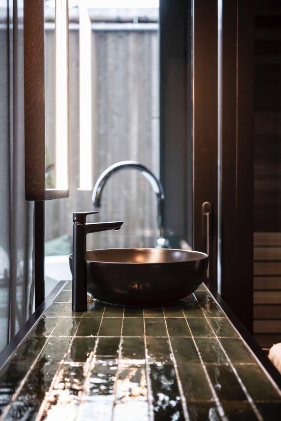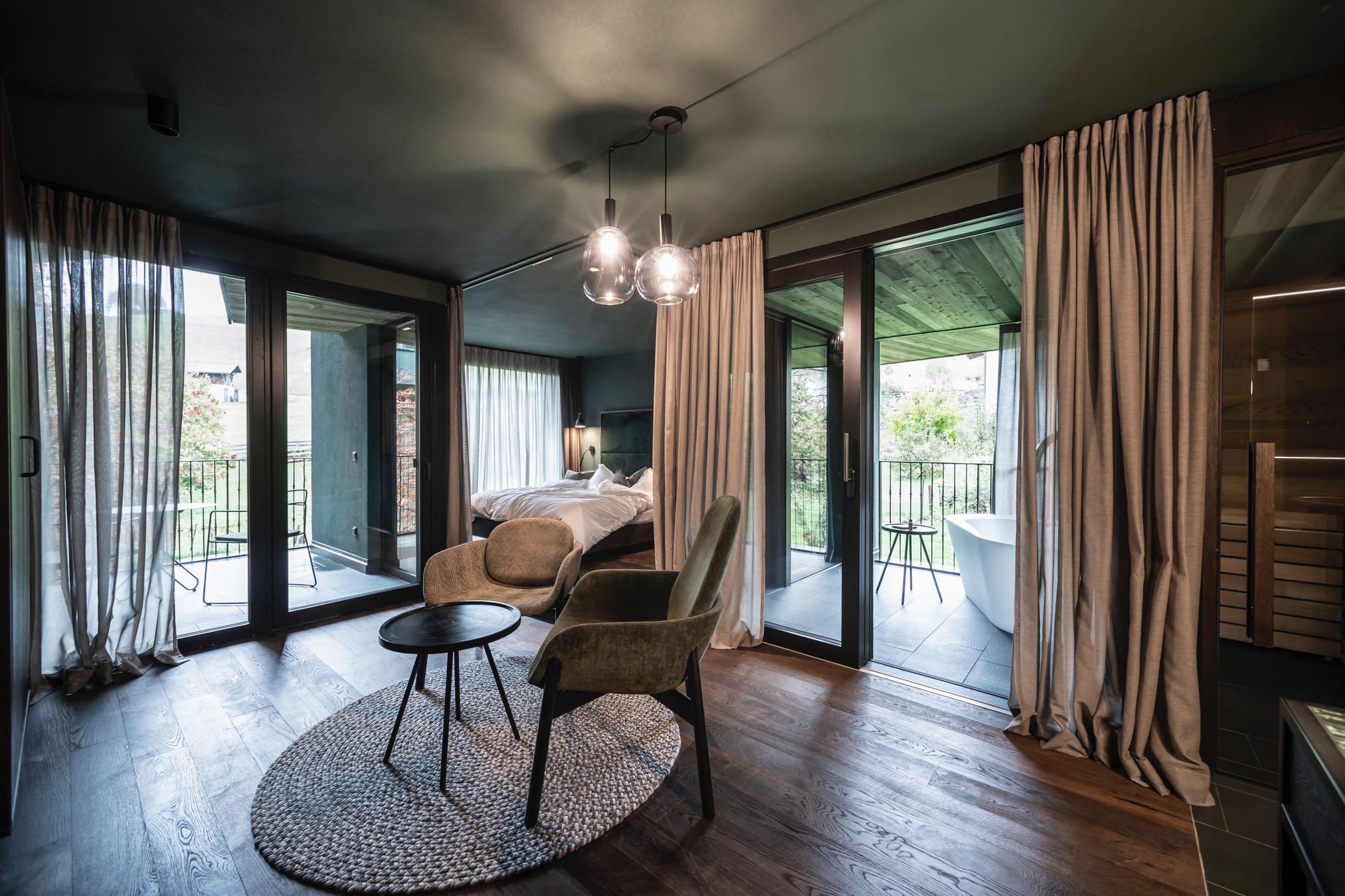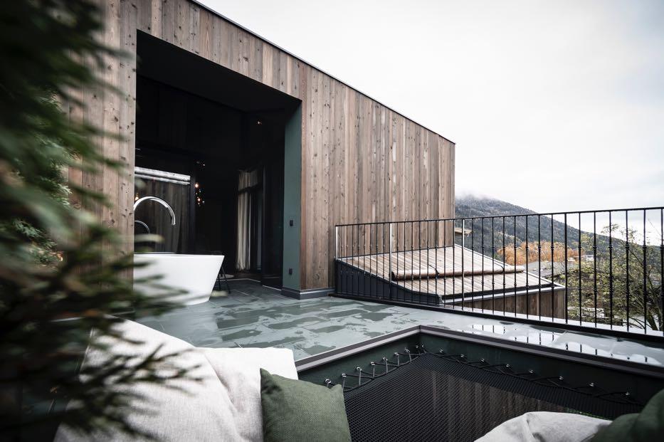 In the suite, a free-standing vanity unit with mirror, which can also be used as a console desk, provides a pivotal point. This is where the bathroom area merges into the living area, which has been wonderfully designed with hybrid furniture The most intimate area is located at the far end of the suite, where the entrance is: an open shower is elegantly flanked on one side by the self-contained toilet and bidet unit, and on the other by a small, private Finnish sauna, which guests can use whenever they wish In addition to the many views and vistas, there is another highlight that makes a stay in the Green Suite irresistible: an open patio with an outdoor hot tub, which complements the sauna offer in an exceptionally appealing way.