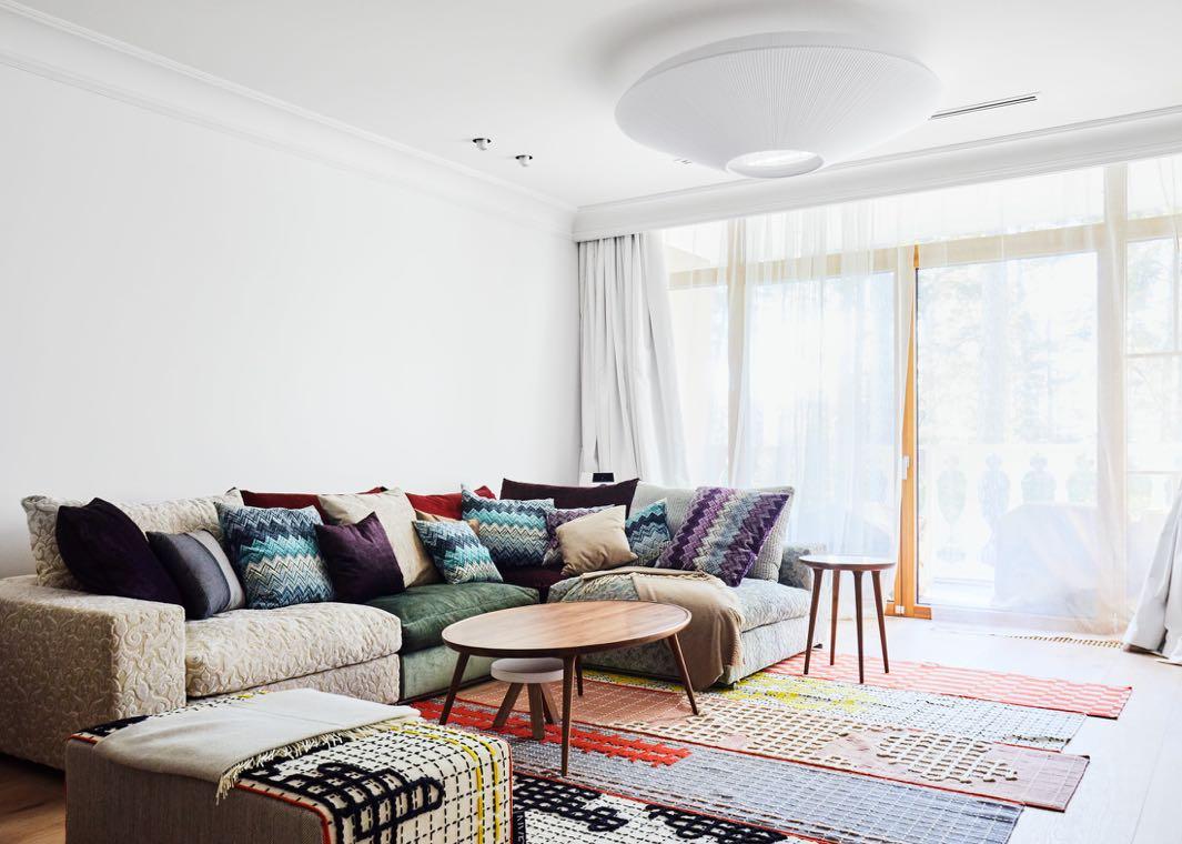 This two-storey apartment is dedicated to a family with kids, and it is just one of their numerous homes. The design of the whole project is inspired by a nostalgia for the summer cottage aesthetic of the 20th century. In this way, to give a strong sense of place, the main source of inspiration was the location itself and its history. Jūrmala is a resort town on the Baltic coast in Latvia On the first floor, the backdrop is kept neutral to direct attention towards the design pieces, texture and materials The choice of materials was also inspired by the natural environment of Jūrmala - its pine forests, dunes, sea and mineral waters, like the solid wood table in the living space. As in the whole apartment, here, Open AD paired also recognizable design pieces with bespoke solutions such as the black wall hung desk .