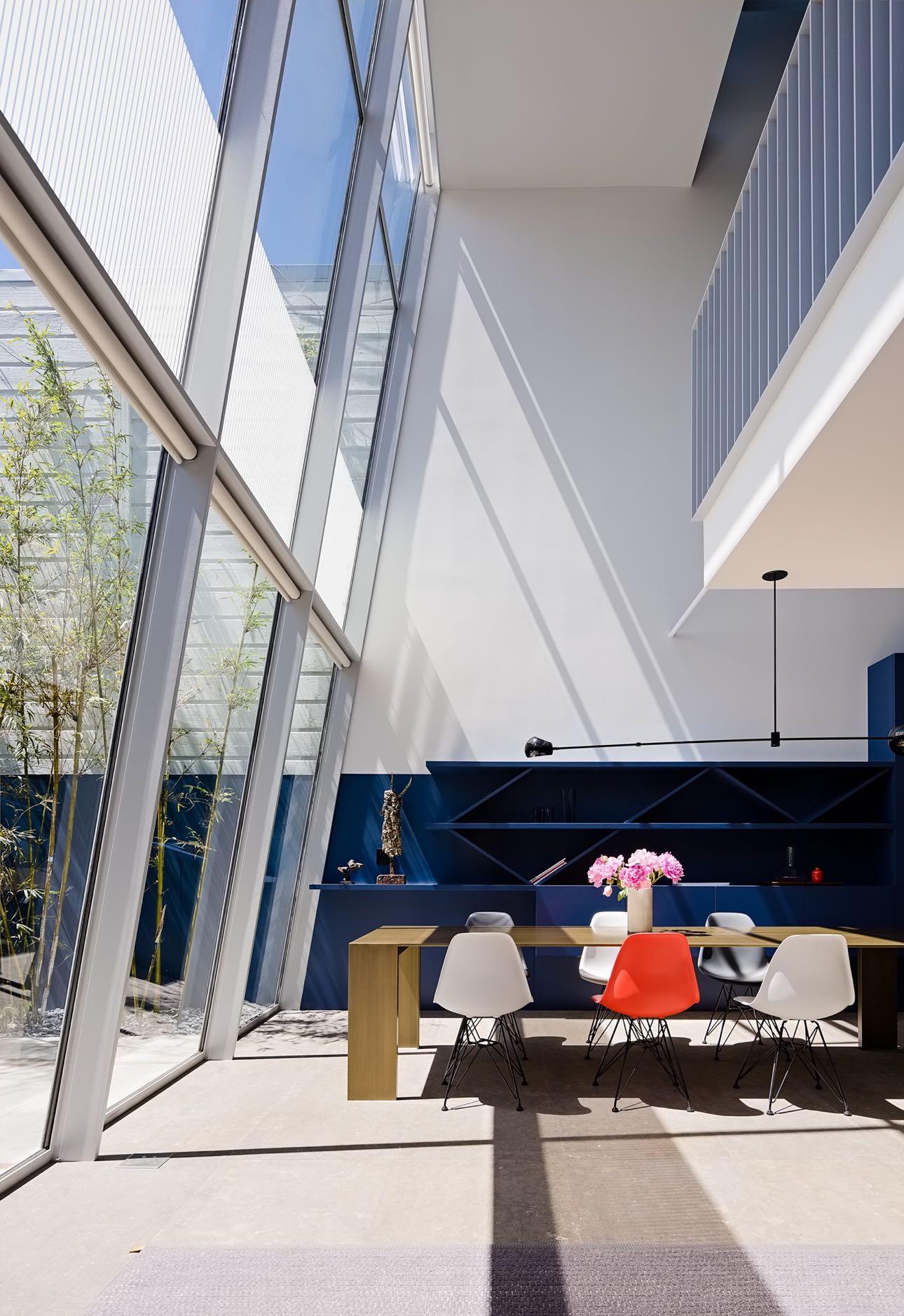 Large sliding doors opens the living room, dining room, and kitchen to the outdoor space. A limestone floor and a blue fence and cabinets blur the line between inside and outside.