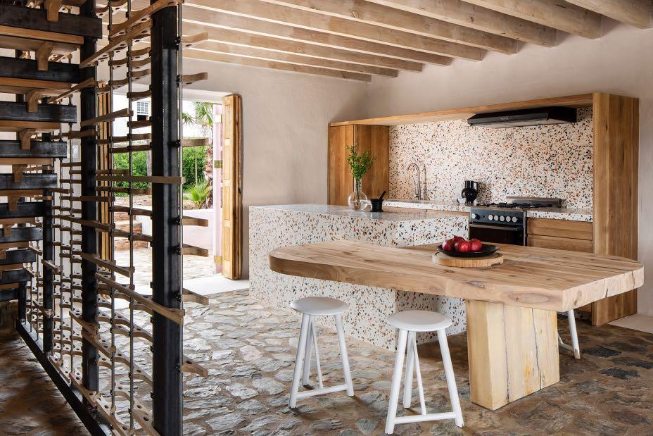 The repairs and restoration of the wine store involved reorganising the ground level so that it could function as a living area and kitchen and locating the bedroom and bathroom on the mezzanine above. On the ground floor, in the kitchen, a contemporary island has been inserted, clad in terrazzo - a contemporary material that goes perfectly with the original materials. The concrete and aggregate in Terrazzo resonate with the stone and cement paving. The kitchen block also makes it possible to keep the kitchen and dining areas integrated, making it a central social space,