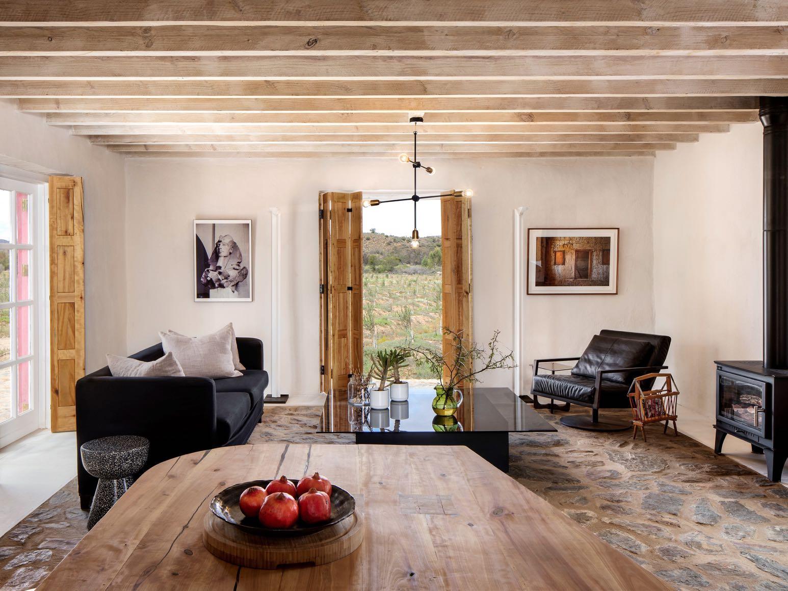The restoration involved a cluster of Cape buildings in a valley beneath the Swartberg mountain range, consisting of a main house and two barns, plus a store A short way off is a flat-roofed building, typical of the Ladismith style, which was originally used as a wine store.